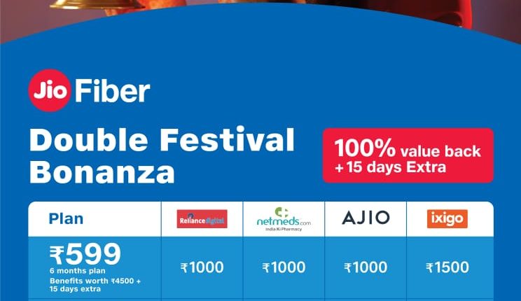 ଜିଓଫାଇବର ଡବଲ୍ ଫେଷ୍ଟିଭାଲ୍ ବୋନାଞ୍ଜା ଅଫର ୧୦୦% ଭାଲ୍ୟୁ ବ୍ୟାକ୍ ସହିତ ଅତିରିକ୍ତ ୧୫ ଦିନର ମାଗଣା ବୈଧତା ୨୦୨୨ ଅକ୍ଟୋବର ୧୮ରୁ ୨୮ ଭିତରେ ଜିଓଫାଇବର୍ ସଂଯୋଗର ସମସ୍ତ ନୂଆ ଗ୍ରାହକଙ୍କ ପାଇଁ ଉପଲବ୍ଧ