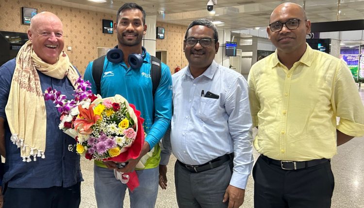 Bhubaneswar, 1 September, 2023 (Pratyusha Bureau): In a historic moment, Kishore Jena, the prodigious javelin thrower from Odisha, returned to his homeland to a heartwarming reception today. The Sports Director, Siddhartha Das, Jt Secretary Ranjit Parida, Head Coach, Odisha Relinace Foundation Athletics HPC, Martin Owens and officials of the Sports & Youth Services Department gathered at the Biju Patnaik International Airport, to extend their enthusiastic welcome to this remarkable athlete, who has made his state and country immensely proud. Kishore Jena, with his incredible talent and relentless dedication, has carved his name into the annals of history as the first athlete from Odisha to represent India in the finals of the prestigious World Athletics Championship, that recently concluded at Budapest. He emerged to be in the top five in the finals there thus making an impression amongst the athletics fraternity of India.