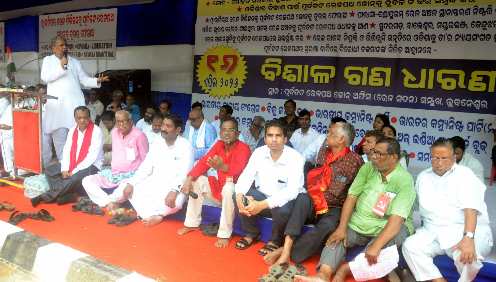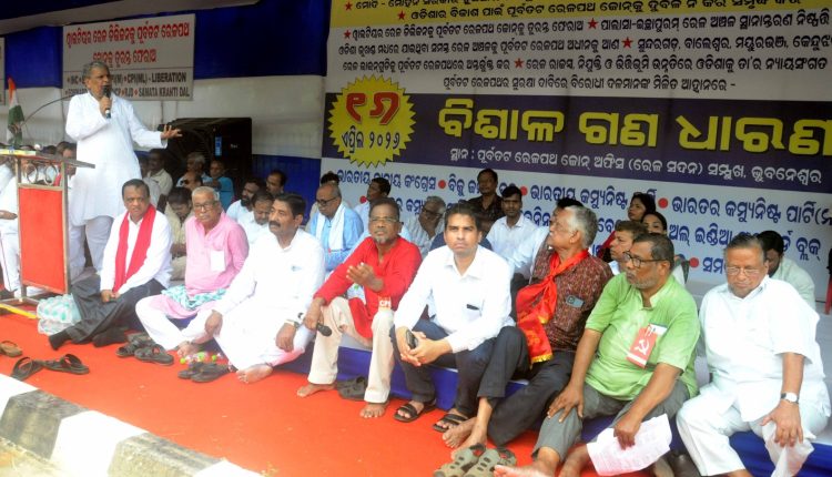 ପୂର୍ବତଟ ରେଳପଥ ଜୋନ୍କୁ ଦୁର୍ବଳ କରିବା ବିରୋଧରେ ରେଳ କ୍ଷେତ୍ର ରେ ଓଡ଼ଶାର ହକ ପାଇଁ ୧୧ଟି ବିରୋଧୀ ଦଳର ମିଳିତ ଗଣ ଧାରଣା ।