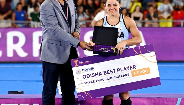 Bhubaneswar,18/06/22 (Pratyusha Bureau):It was a moment of great pride for Odisha as Indian Former Hockey Captain and Chairman, Odisha Hockey Promotion Council, Dilip Tirkey presented the Odisha Player of the Tournament to Maria Grannato of Argentina at the closing of the FIH Women’s Hockey World Cup 2022 at Terrassa, Spain, while the crowd cheered with aplomb for the young winner and the legendary hockey player. It was a delight for hockey fans in the stand and former hockey players at the event to see the legendary Dilip Tirkey former Indian Hockey Captain and by far the best defender amongst them at the spectacular finals of the 2022 FIH Hockey Women’s World Cup.